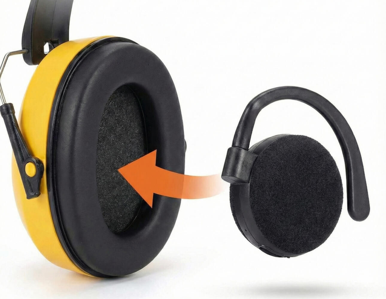 Ultra-slim TWS earhooks with a design that slide directly into the interior of standard earmuffs, locking into place to provide high-quality audio without modifying the exterior. This seamless integration turns standard hearing protection into a wireless headset while maintaining a completely stock appearance from the outside.